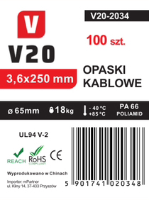 Mocne opaski zaciskowe V20 czarne 3,6 mm x 250 mm - 100 sztuk