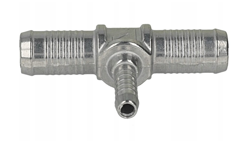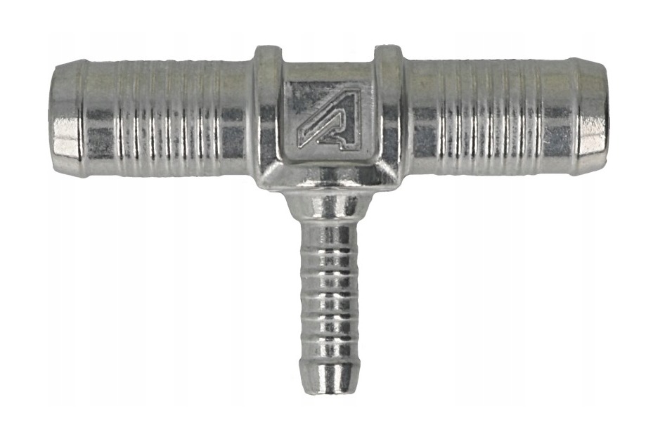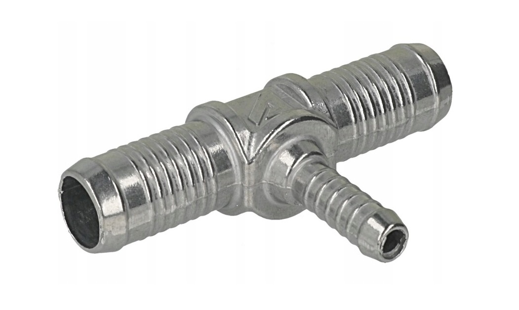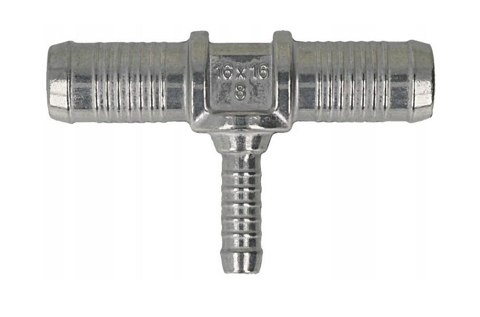 Aluminiowy trójnik w kształcie litery "T" do przewodu wodnego o średnicy 16 milimetrów, dwa króćce przelotowe 16 milimetrów i jeden do przewodu o średnicy 8 milimetrów.